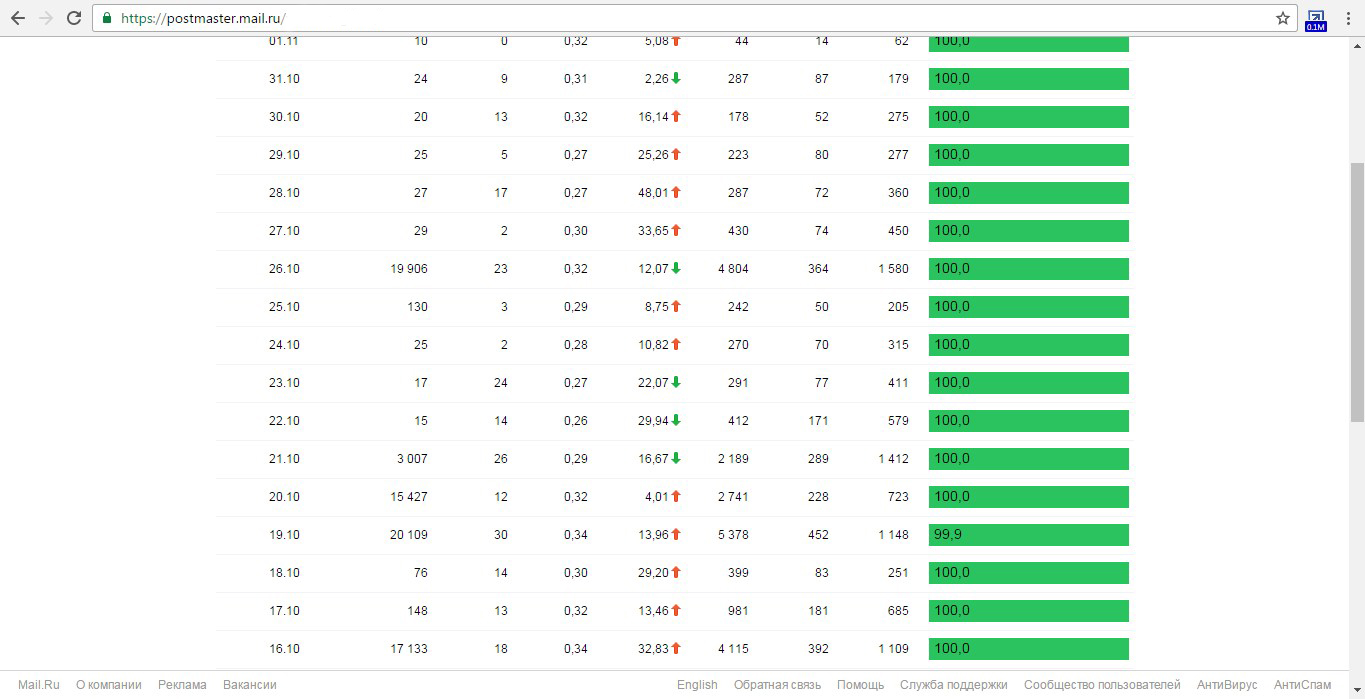 Статистика отправки сообщения POSTMASTER от mail.ru